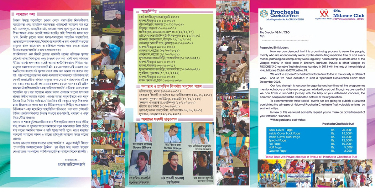 PROCHESTA acknowledges with gratitude the generous assistance being rendered by renowned Physicians selfless services, Pharmaceutical Companies and Pathological laboratories and contributions being made by a large number of compassionate citizens from within and outside the Colony spontaneously.